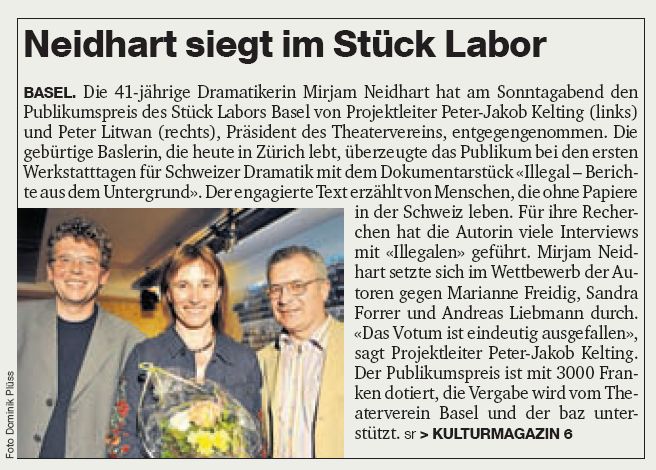 Das Stück wurde im Rahmen vom Stücklabor Basel, 2008 mit dem Publikumspreis ausgezeichnet. Als Hörbuch erschienen bei Christoph Merian Verlag erschienen unter der Regie von Peter-Jakob Kelting.